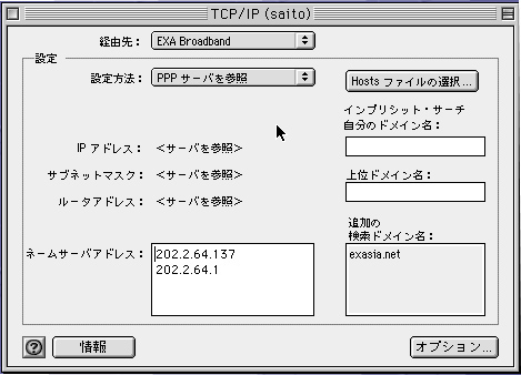 経由先を「EXA Broadband」、設定方法は「PPPサーバーを参照」を選択し、ネームサーバーアドレスには上から「202.2.64.137」、次に「202.2.64.1」と入力し、TCP/IPコントロールパネルを閉じます。この際変更内容を保存するかどうかきかれましたら、「保存」を選択し次のステップに進みます。