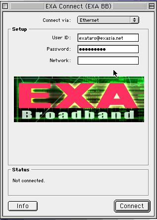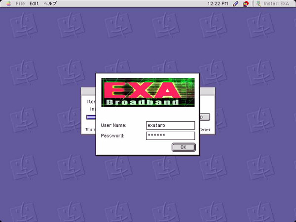 E必要なドライバをインストールします(後部画面)。終了するとEXA Broadbandの接続画面が出ますので図のようにUser NameにはXXXX@exasia.net、及びパスワードを入力してください。その後PC自動的に再起動されます。
