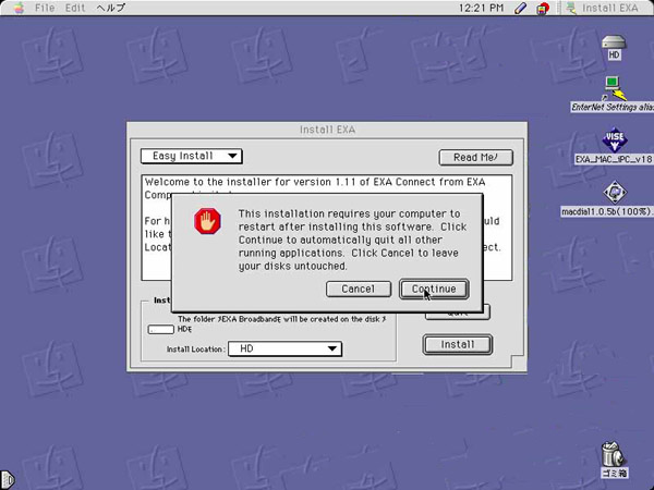 Dインストール開始前に上記と同様文が表示されます:「インストール後自動的にPCを再起動する」という内容ですのでそのまま「Continue」をクリックしてください。